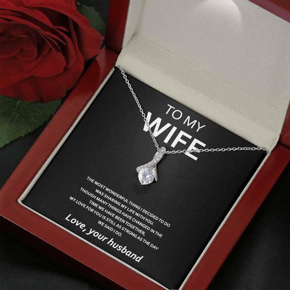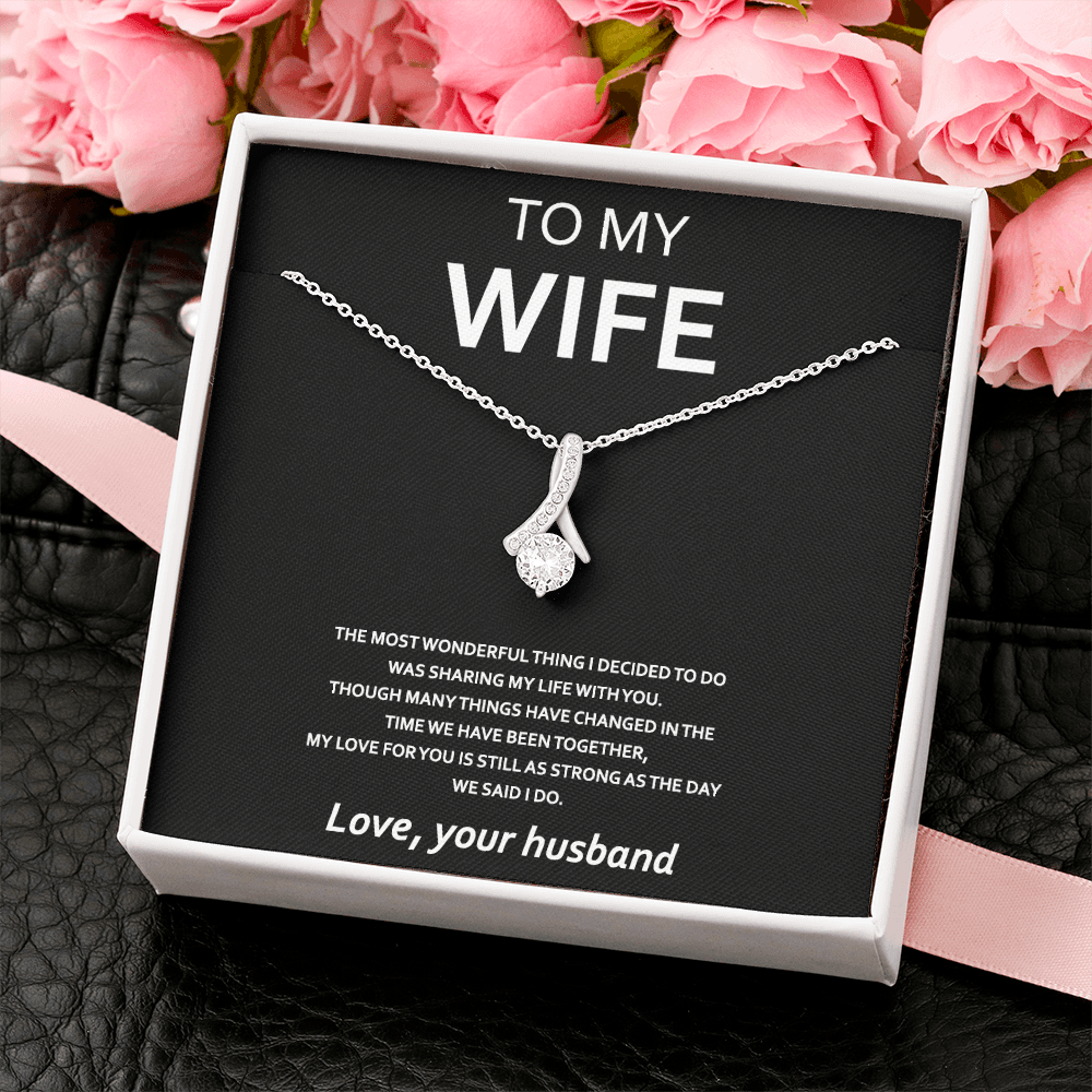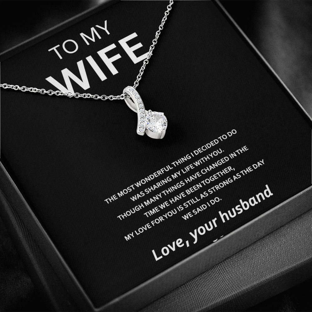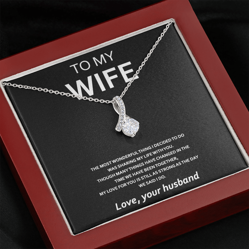 Melt her heart with this ALLURING BEAUTY necklace gift! The petite ribbon shaped pendant is finished with 14K white gold over stainless steel, and is embellished with dainty clear crystals surrounded by a sparkling 7mm round cut Cubic Zirconia.