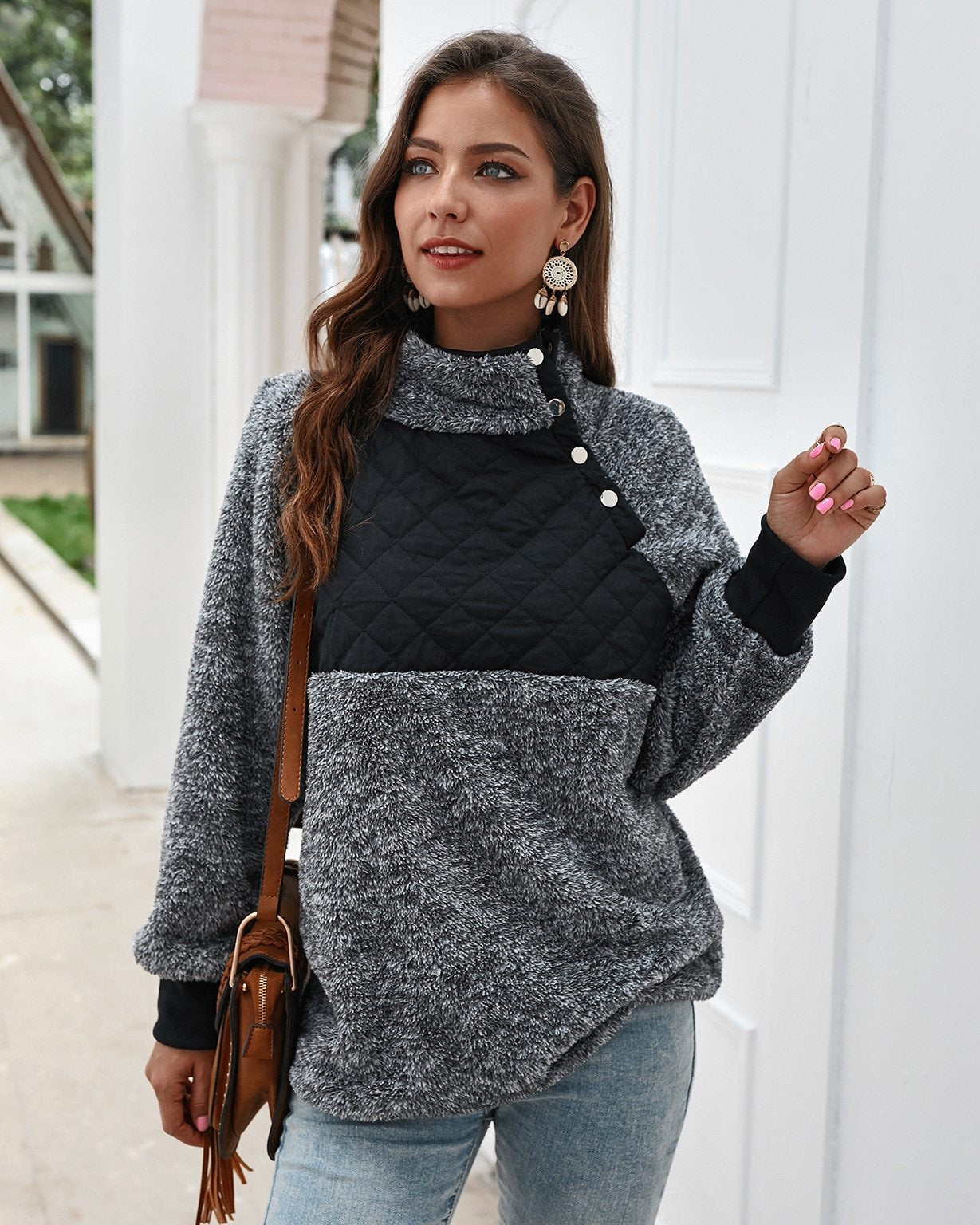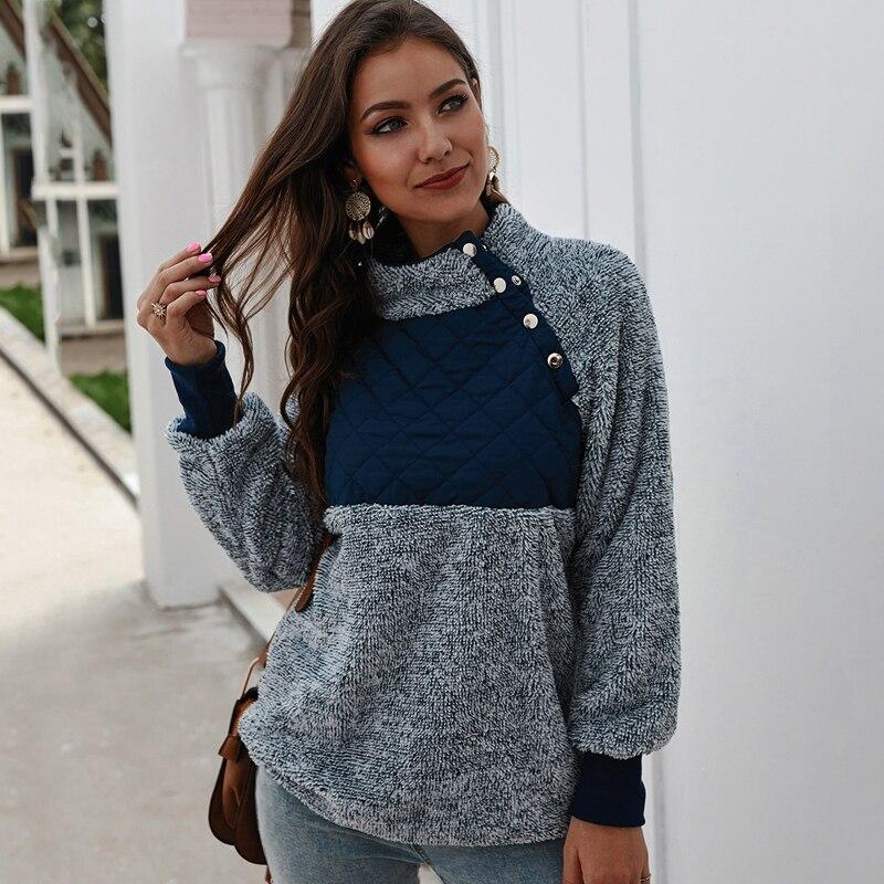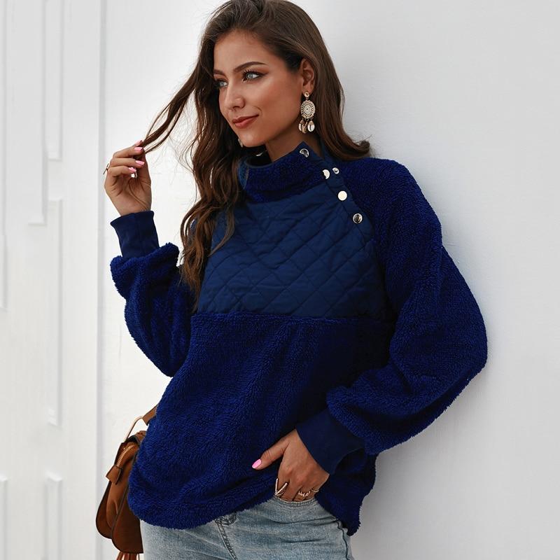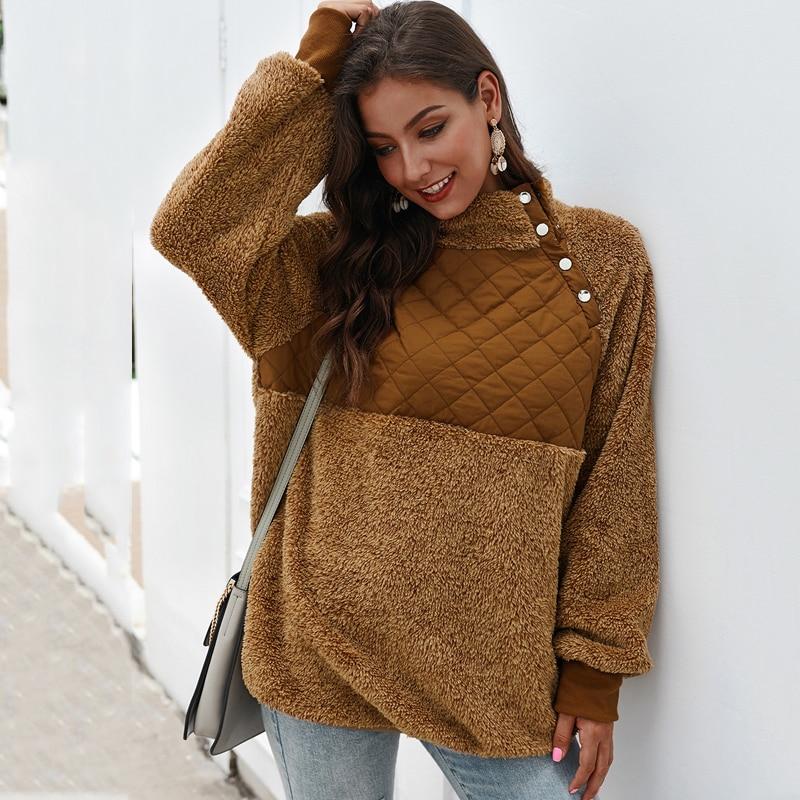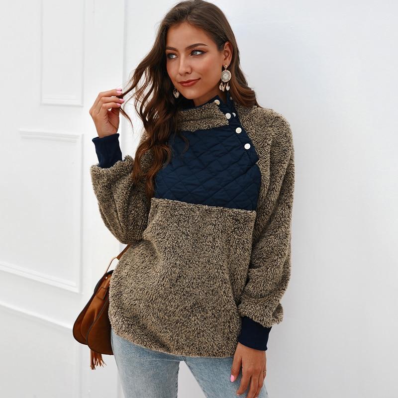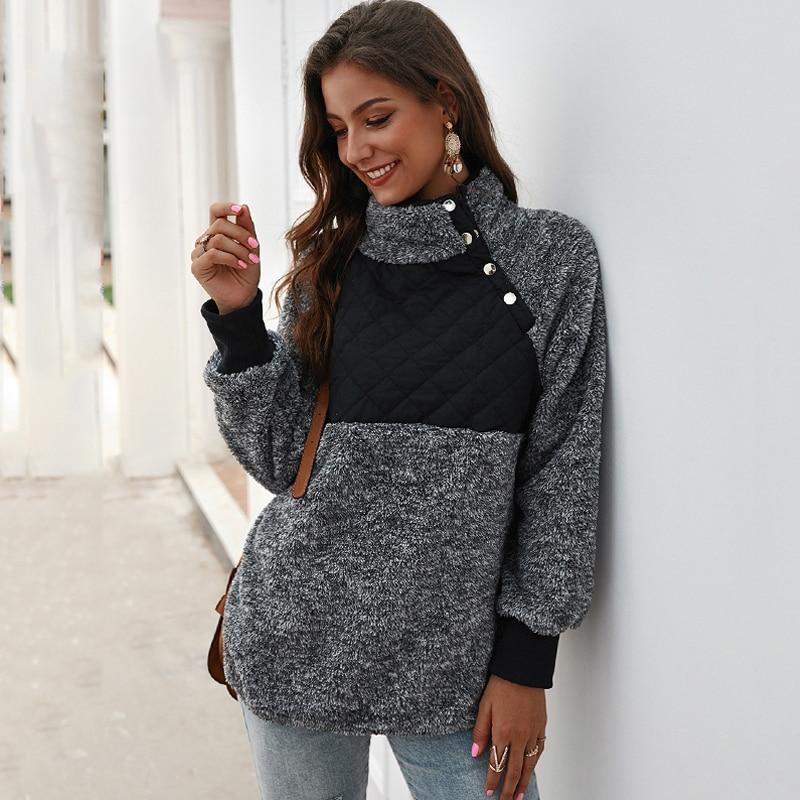 Comfortable and oversized, this fleece features quilted puffer, asymmetrical color block. It elevates just a classic pullover to make it look a bit nicer and pulled together. Soft fleece pullover with asymmetrical snap-up front neckline, quilting detail, side-entry pockets, ribbed cuffs and piping along curved hem. This women fuzzy fleecesweatshirt is for any teens & adults, any body type, forany layers underneath, and for any winter & spring weather.